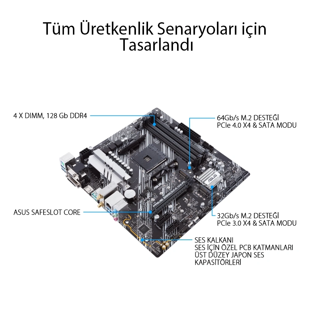 Prime B550M-A (Wi-Fi)ASUS Prime serisi, 3. Nesil AMD Ryzen platformunun tüm potansiyelini ortaya çıkarmak için özenle geliştirildi. Sağlam güç tasarımına, kapsamlı soğutma çözümlerine ve akıllı ayar seçeneklerine sahip olan Prime B550 serisi anakartlar, günlük kullanıcılara ve kendi PC'lerini toplayan kişilere kullanışlı yazılımlar ve özelliklerle çeşitli performans ayarı seçenekleri sunuyor. AMD AM4 soket: 3.Nesil AMD Ryzen™ İşlemcilerine hazır Kapsamlı soğutma: VRM soğutma bloğu, PCH soğutma bloğu ve Fan Xpert 2+ Ultra hızlı bağlantılar: Çift M.2, PCIe 4.0, Intel® WiFi 6, 1 Gb Ethernet, USB 3.2 Gen 2 Type-A Aura Sync RGB: RGB LED şeritler için yerleşik adreslenebilir Gen 2 başlıklar, Aura Sync özellikli donanımla kolayca senkronize edilirVRM Soğutma Bloğu ve Termal DolgularTermal dolguların altındaki VRM soğutma bloğu, MOSFET'ler ve bobinlerdeki ısı aktarımını artırarak daha iyi soğutma performansı sağlar.Daha Serin Tasarım Prime B550 serisi, Fan Xpert 2+ veya UEFI BIOS üzerinden yapılan, kapsamlı soğutma kontrollerine sahiptir.Birden fazla sıcaklık kaynağı