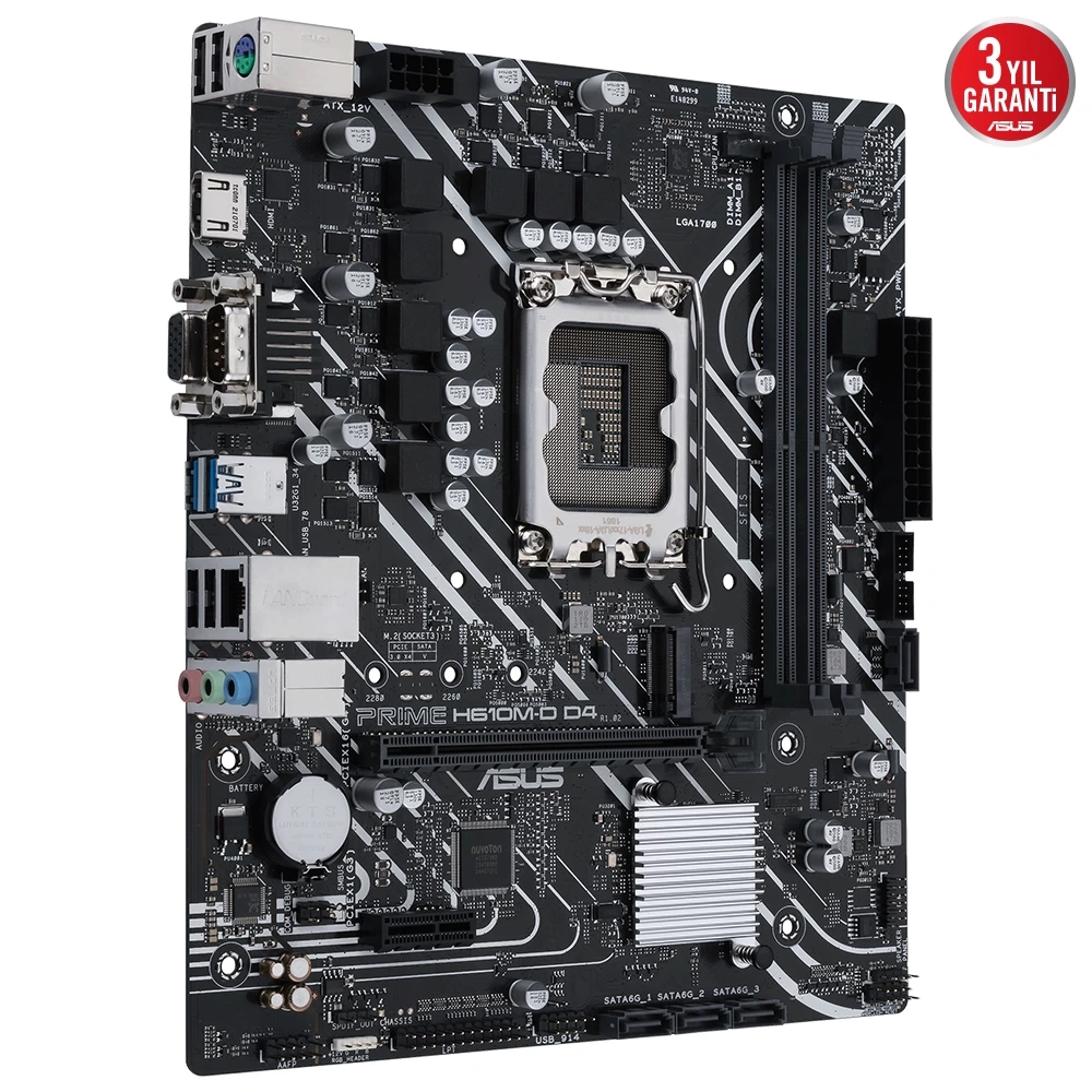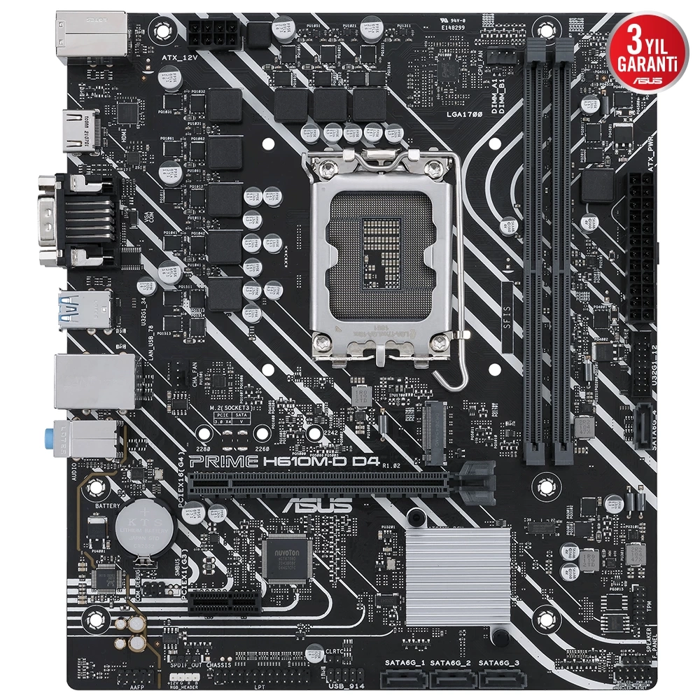 Intel® H610 (LGA 1700) mic-ATX anakart. DDR4, PCIe 4.0, M.2 yuvası, Realtek 1 Gb Ethernet, HDMI®, D-Sub, USB 3.2 Gen 1 bağlantı noktaları, SATA 6 Gbps, COM başlığı, LPT başlığı, RGB başlığı