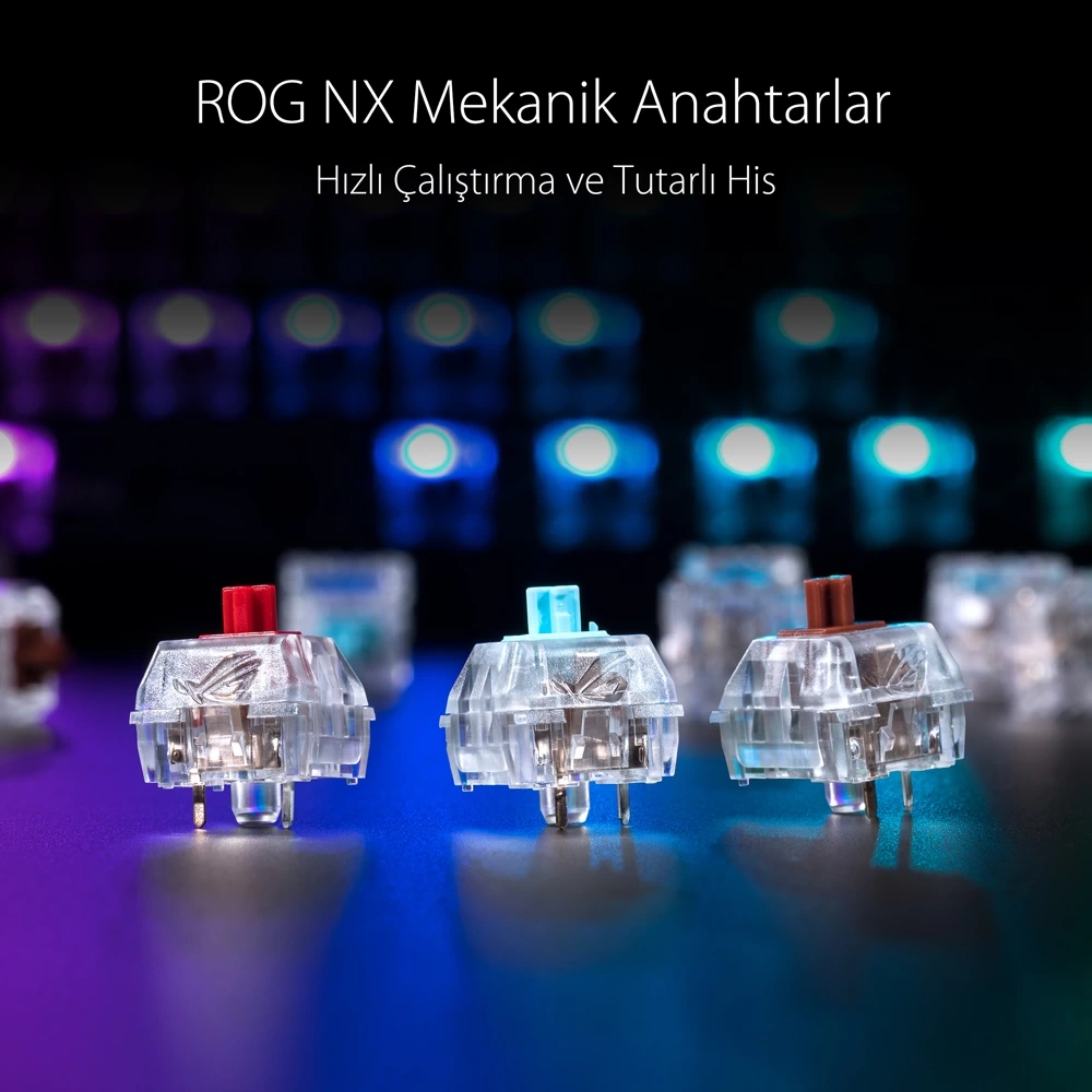 - ROG-Özel Oyun Anahtarları: Hızlı çalıştırma, harika tuş vuruşu hissi ve geri bildirim için ayarlanmış kuvvet eğrilerine sahip ROG NX Mekanik Anahtar